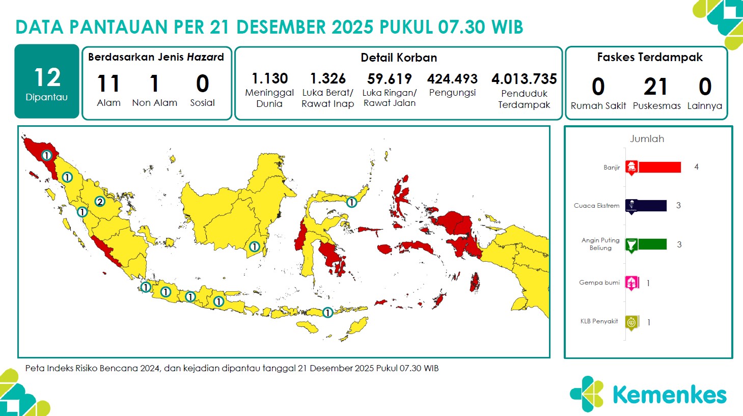 Disini anda dapat mengunduh laporan pemantauan harian berpotensi kejadian Krisis Kesehatan tanggal 21 Desember 2025 Lihat Laporan Pemantauan Harian Pusat Krisis Kesehatan 21 Desember 2025