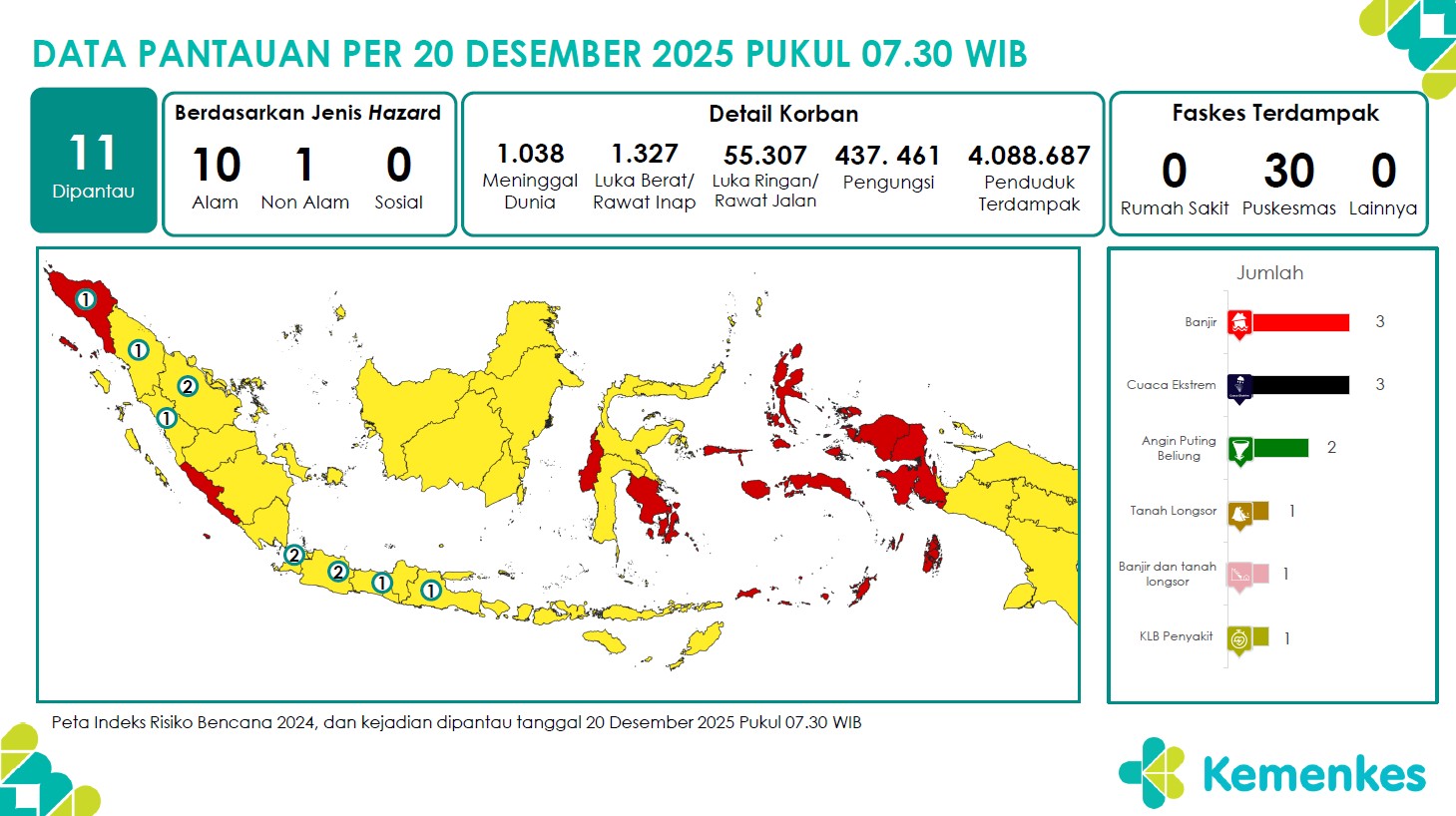 Disini anda dapat mengunduh laporan pemantauan harian berpotensi kejadian Krisis Kesehatan tanggal 20 Desember 2025 Lihat Laporan Pemantauan Harian Pusat Krisis Kesehatan 20 Desember 2025