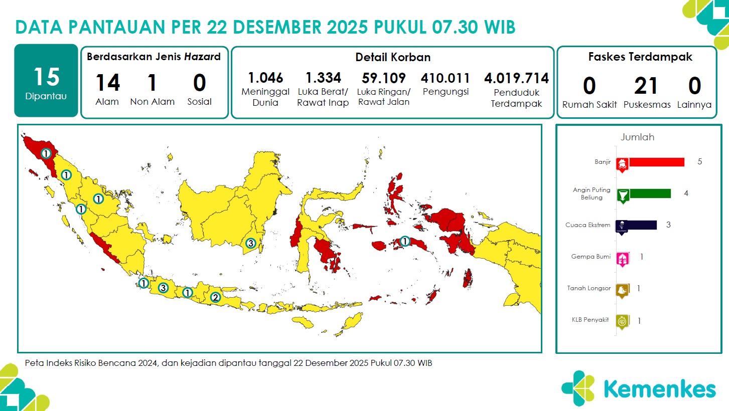 Disini anda dapat mengunduh laporan pemantauan harian berpotensi kejadian Krisis Kesehatan tanggal 22 Desember 2025 Lihat Laporan Pemantauan Harian Pusat Krisis Kesehatan 22 Desember 2025