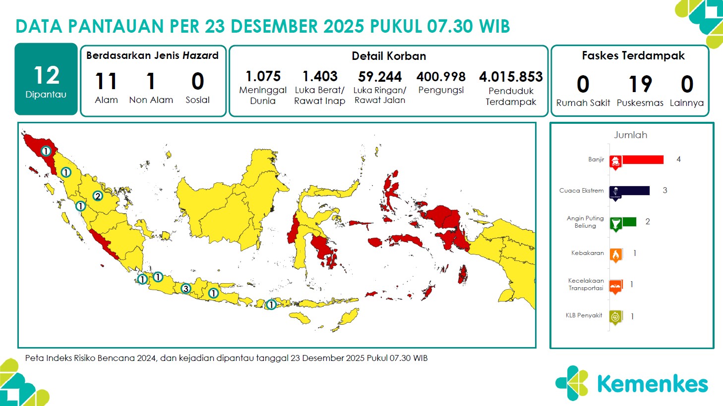 Disini anda dapat mengunduh laporan pemantauan harian berpotensi kejadian Krisis Kesehatan tanggal 23 Desember 2025 Lihat Laporan Pemantauan Harian Pusat Krisis Kesehatan 23 Desember 2025