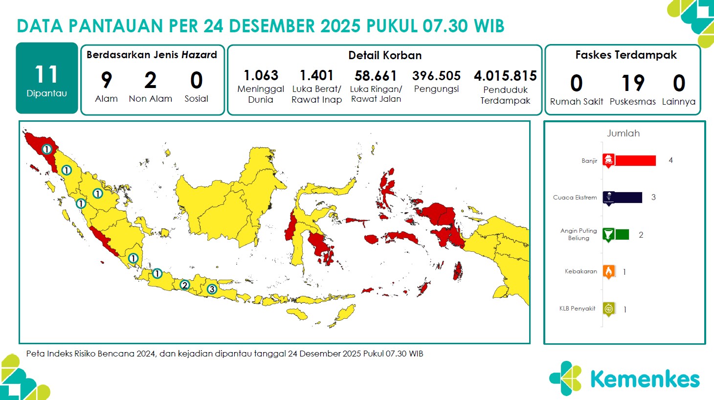 Disini anda dapat mengunduh laporan pemantauan harian berpotensi kejadian Krisis Kesehatan tanggal 24 Desember 2025 Lihat Laporan Pemantauan Harian Pusat Krisis Kesehatan 24 Desember 2025