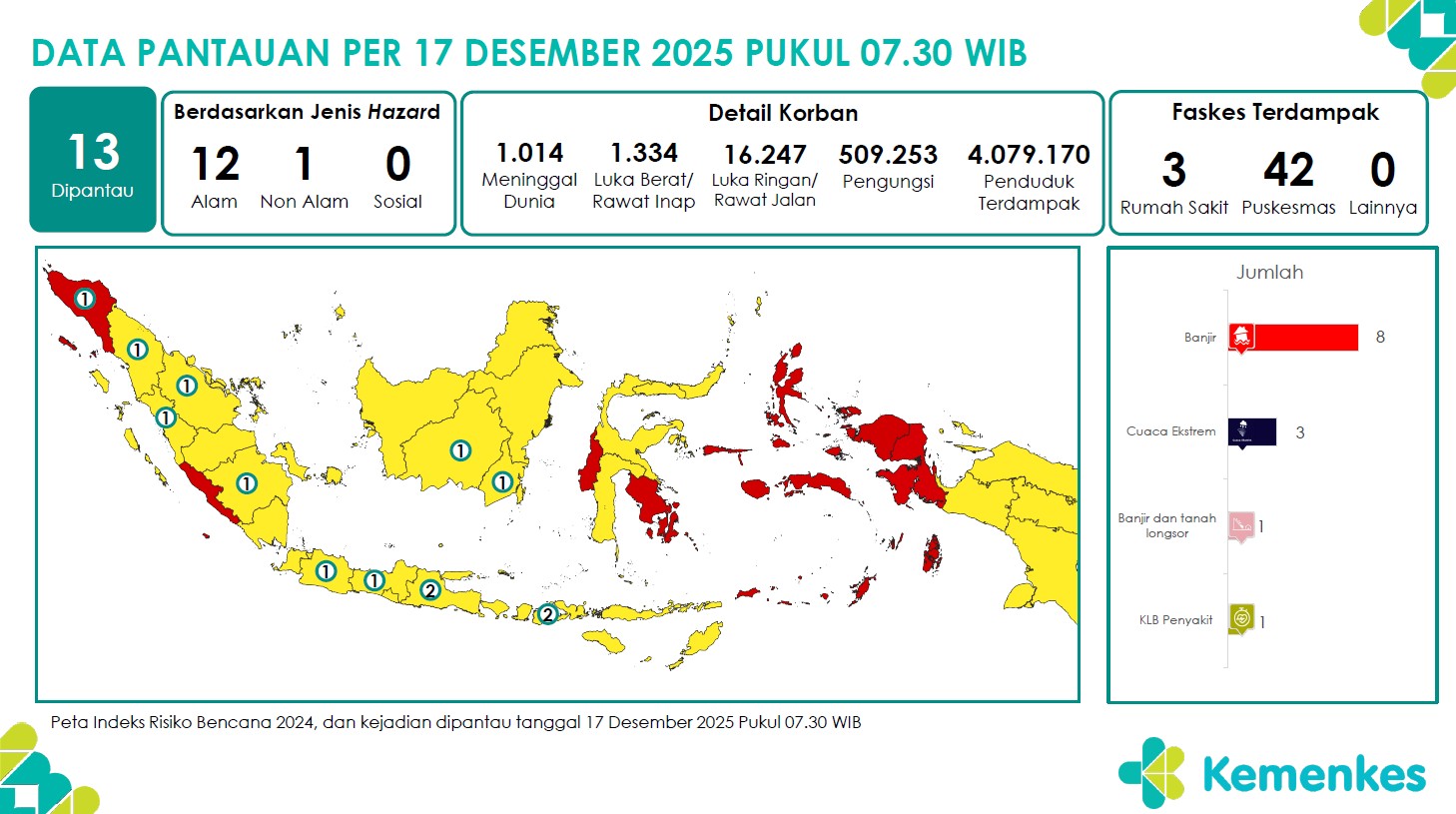 Disini anda dapat mengunduh laporan pemantauan harian berpotensi kejadian Krisis Kesehatan tanggal 17 Desember 2025 Lihat Laporan Pemantauan Harian Pusat Krisis Kesehatan 17 Desember 2025