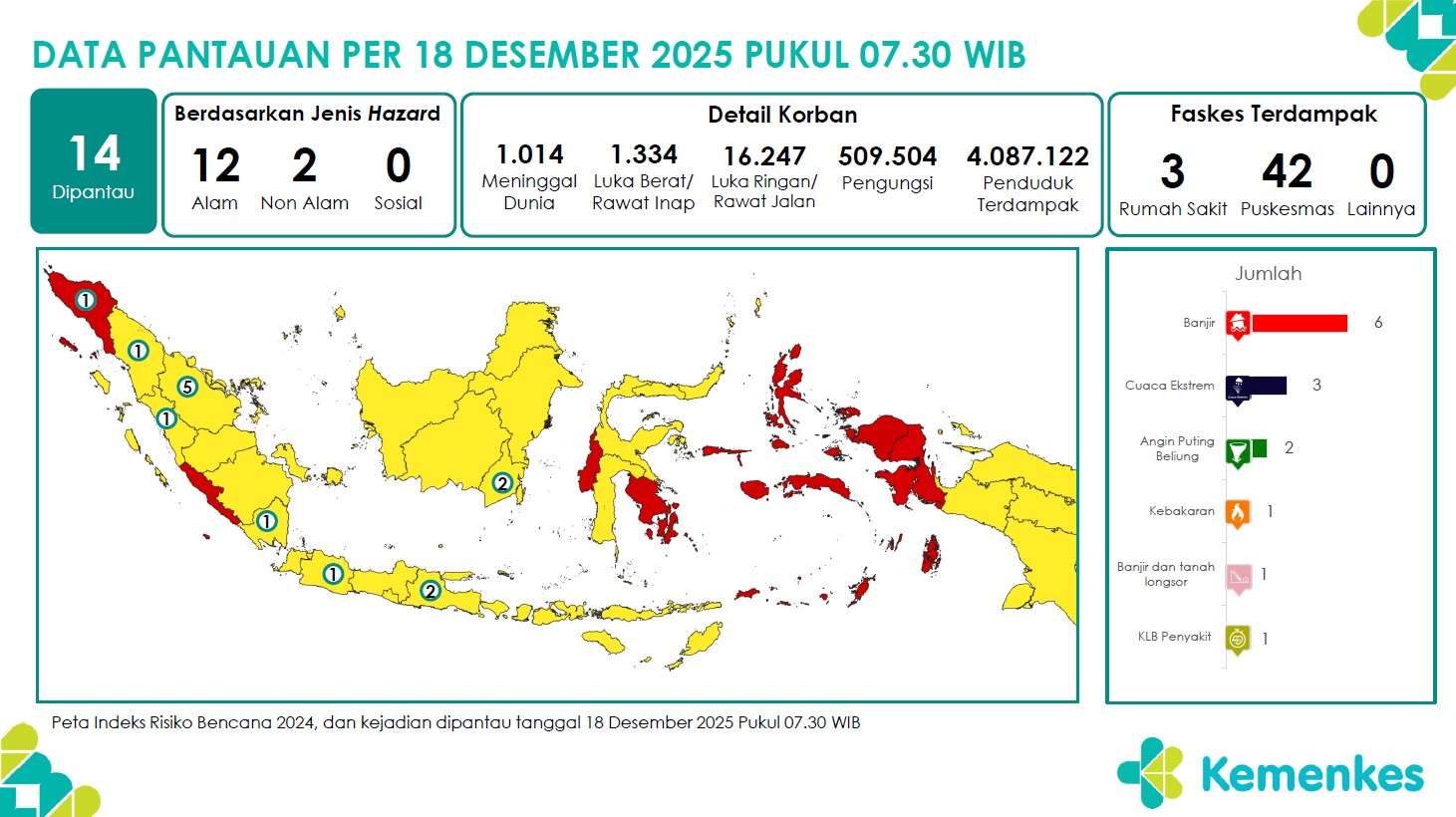 Disini anda dapat mengunduh laporan pemantauan harian berpotensi kejadian Krisis Kesehatan tanggal 18 Desember 2025 Lihat Laporan Pemantauan Harian Pusat Krisis Kesehatan 18 Desember 2025