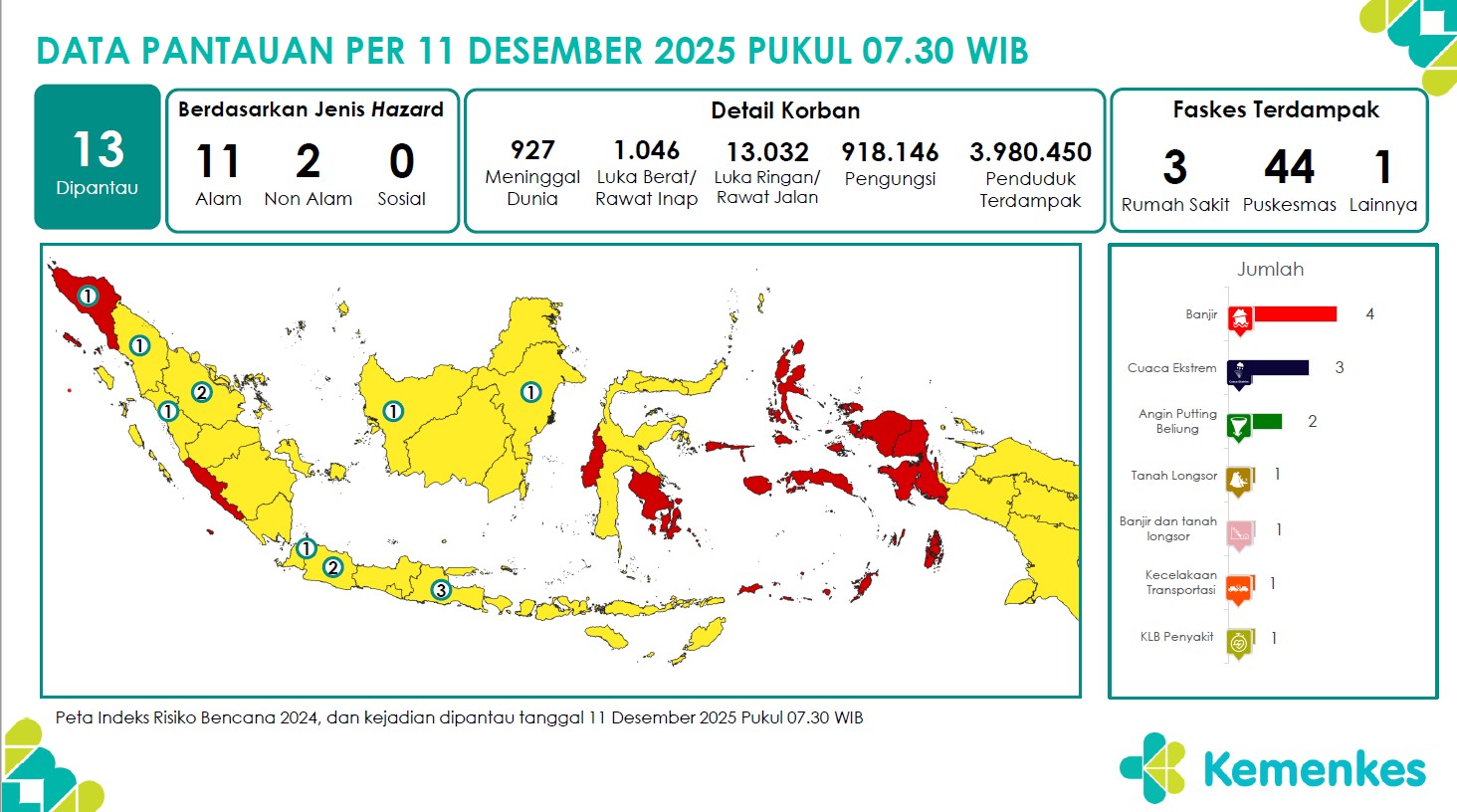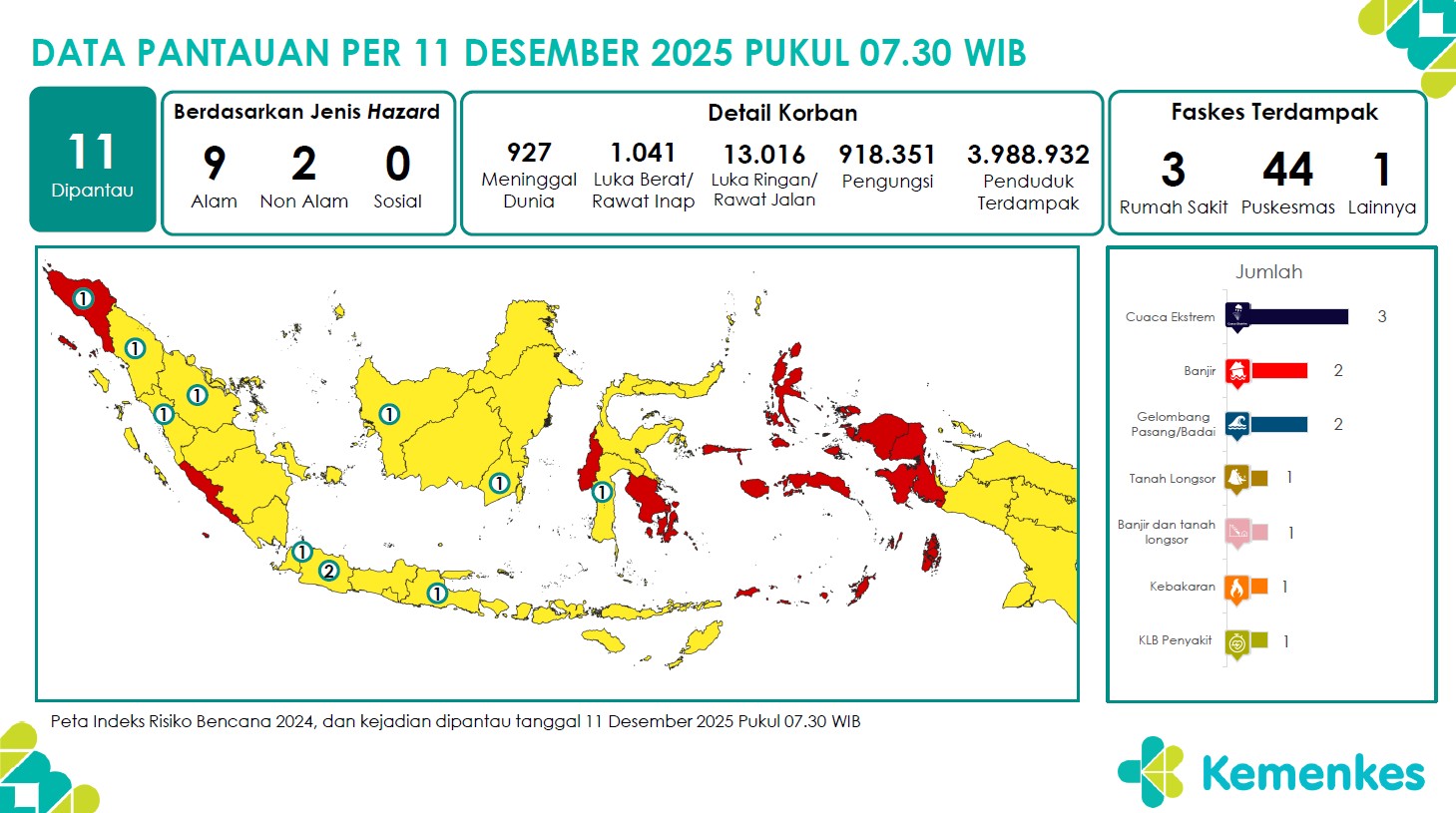 Disini anda dapat mengunduh laporan pemantauan harian berpotensi kejadian Krisis Kesehatan tanggal 11 Desember 2025 Lihat Laporan Pemantauan Harian Pusat Krisis Kesehatan 11 Desember 2025