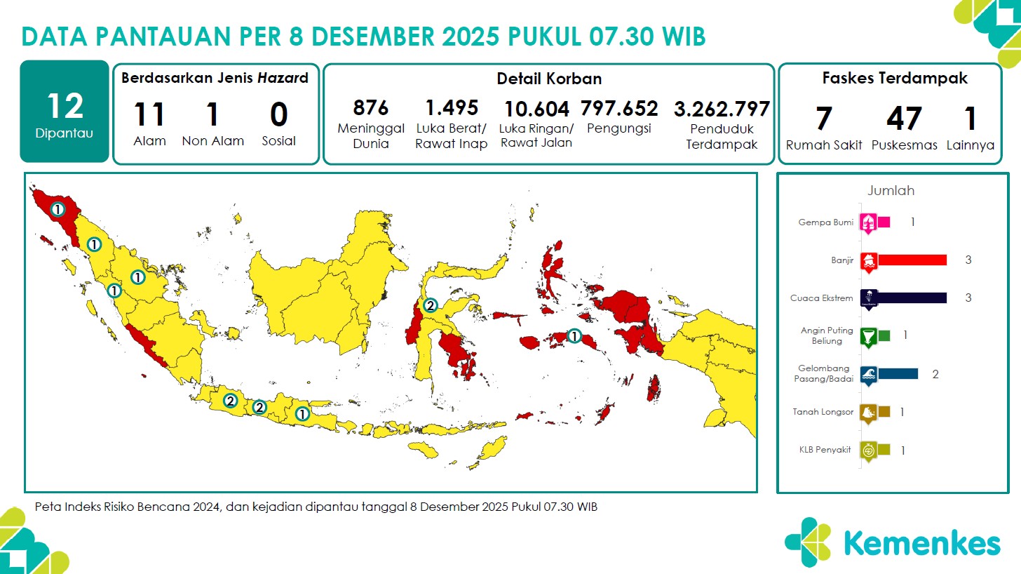 Disini anda dapat mengunduh laporan pemantauan harian berpotensi kejadian Krisis Kesehatan tanggal 8 Desember 2025 Lihat Laporan Pemantauan Harian Pusat Krisis Kesehatan 8 Desember 2025