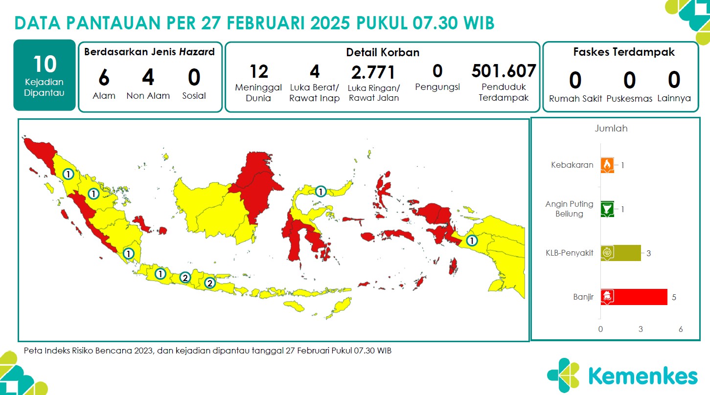 Disini anda dapat mengunduh Laporan Pemantauan Harian Kejadian Krisis Kesehatan Pusat Krisis Kesehatan Kementerian Kesehatan tanggal 27 Februari 2025 pukul 07.30 WIB hingga 28 Februari 2025 pukul 0...
