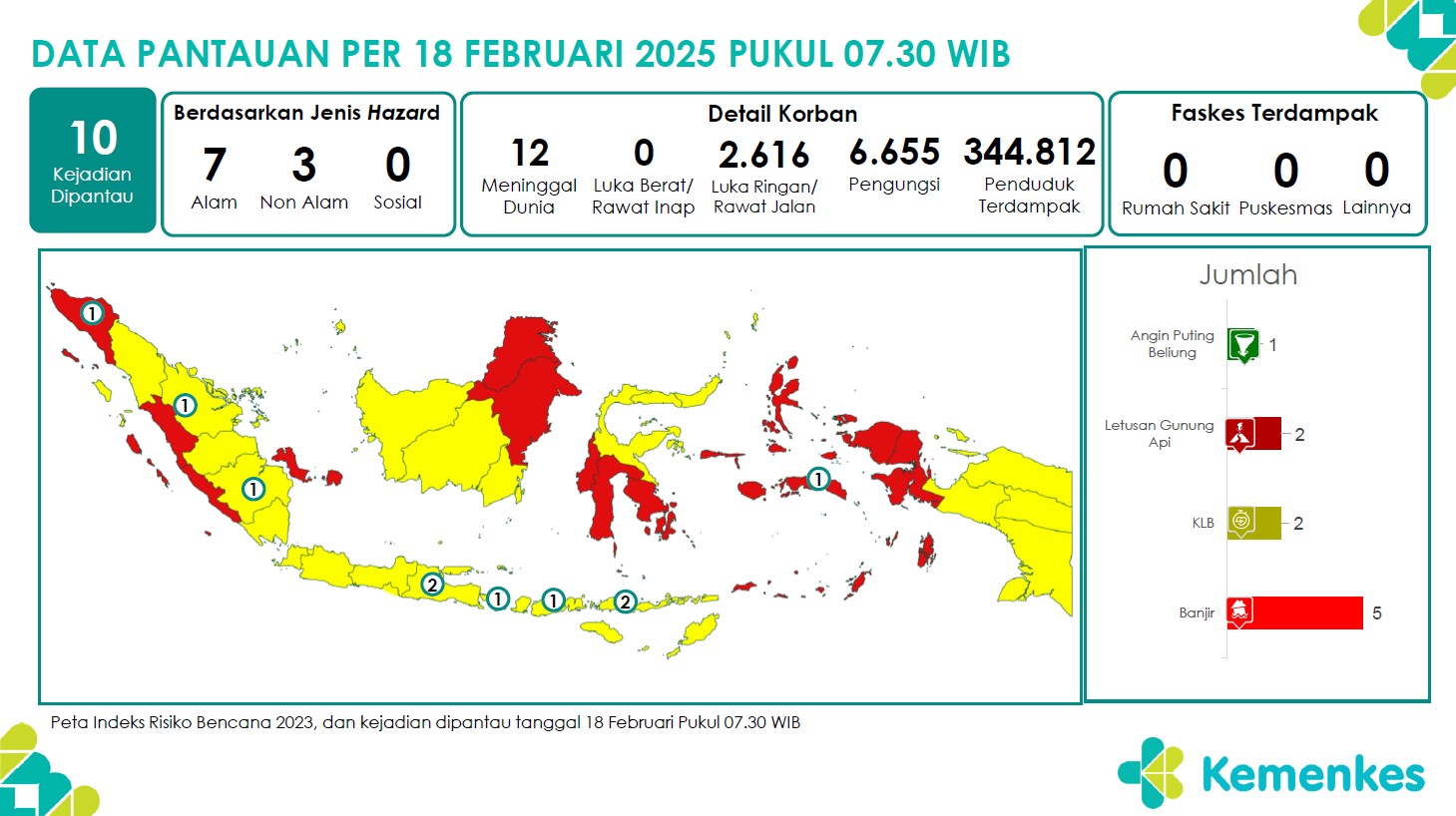 Disini anda dapat mengunduh Laporan Pemantauan Harian Kejadian Krisis Kesehatan Pusat Krisis Kesehatan Kementerian Kesehatan tanggal 18 Februari 2025 pukul 07.30 WIB hingga 19 Februari 2025 pukul 0...