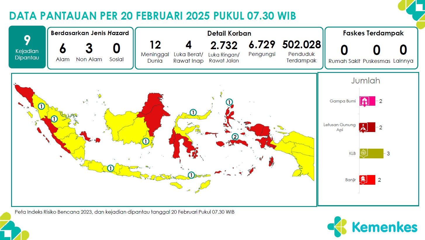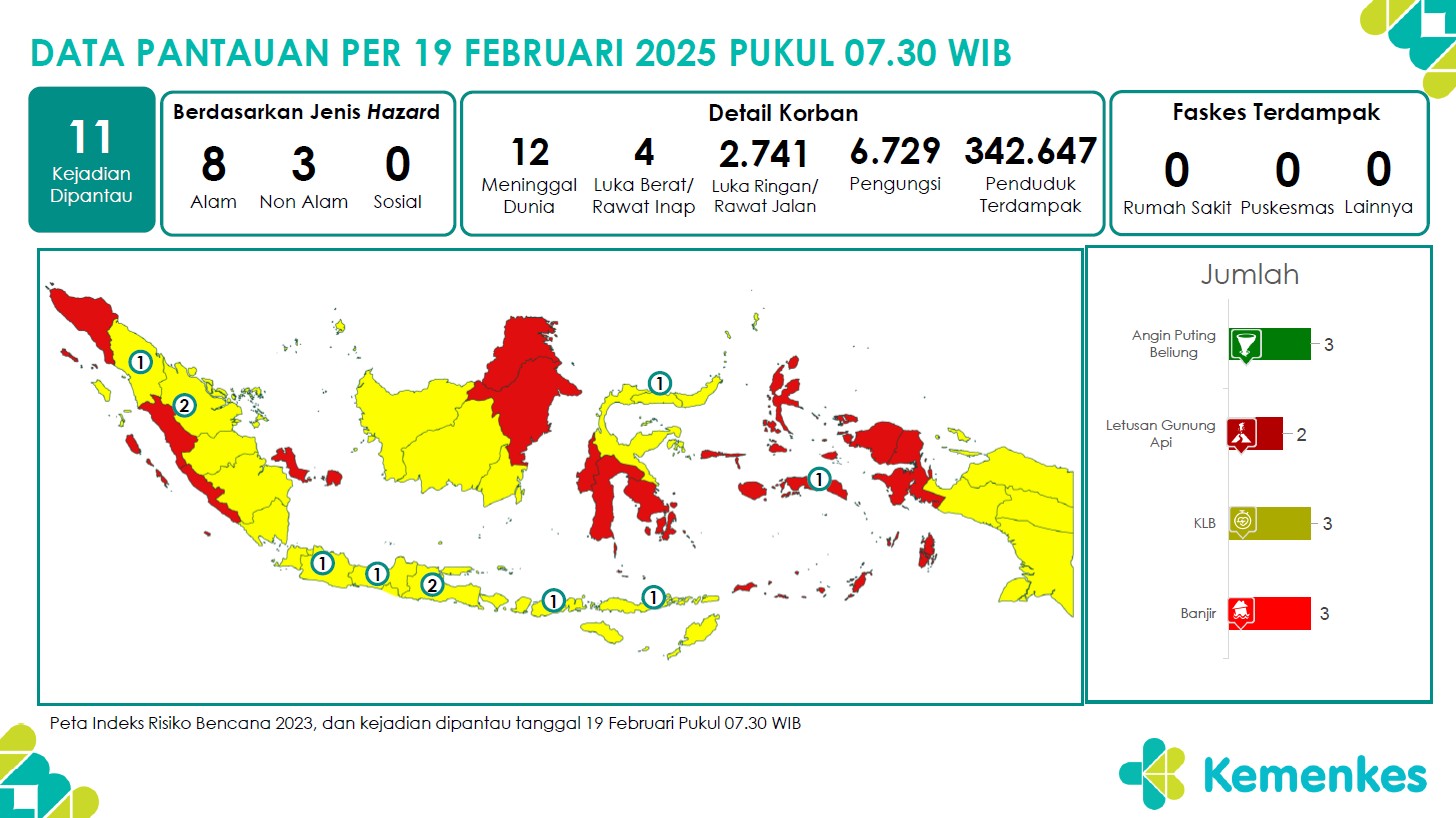 Disini anda dapat mengunduh Laporan Pemantauan Harian Kejadian Krisis Kesehatan Pusat Krisis Kesehatan Kementerian Kesehatan tanggal 19 Februari 2025 pukul 07.30 WIB hingga 20 Februari 2025 pukul 0...