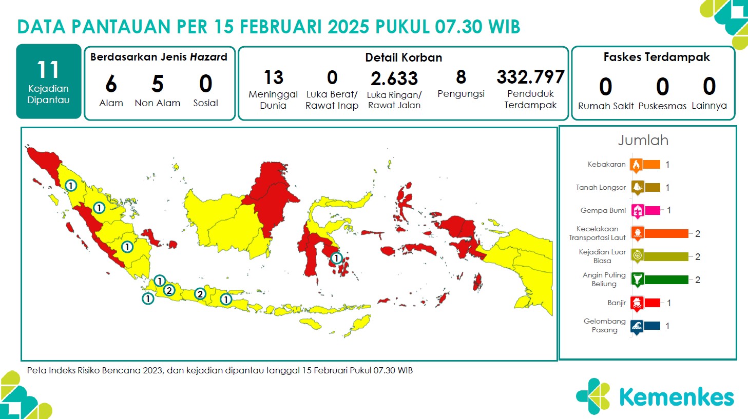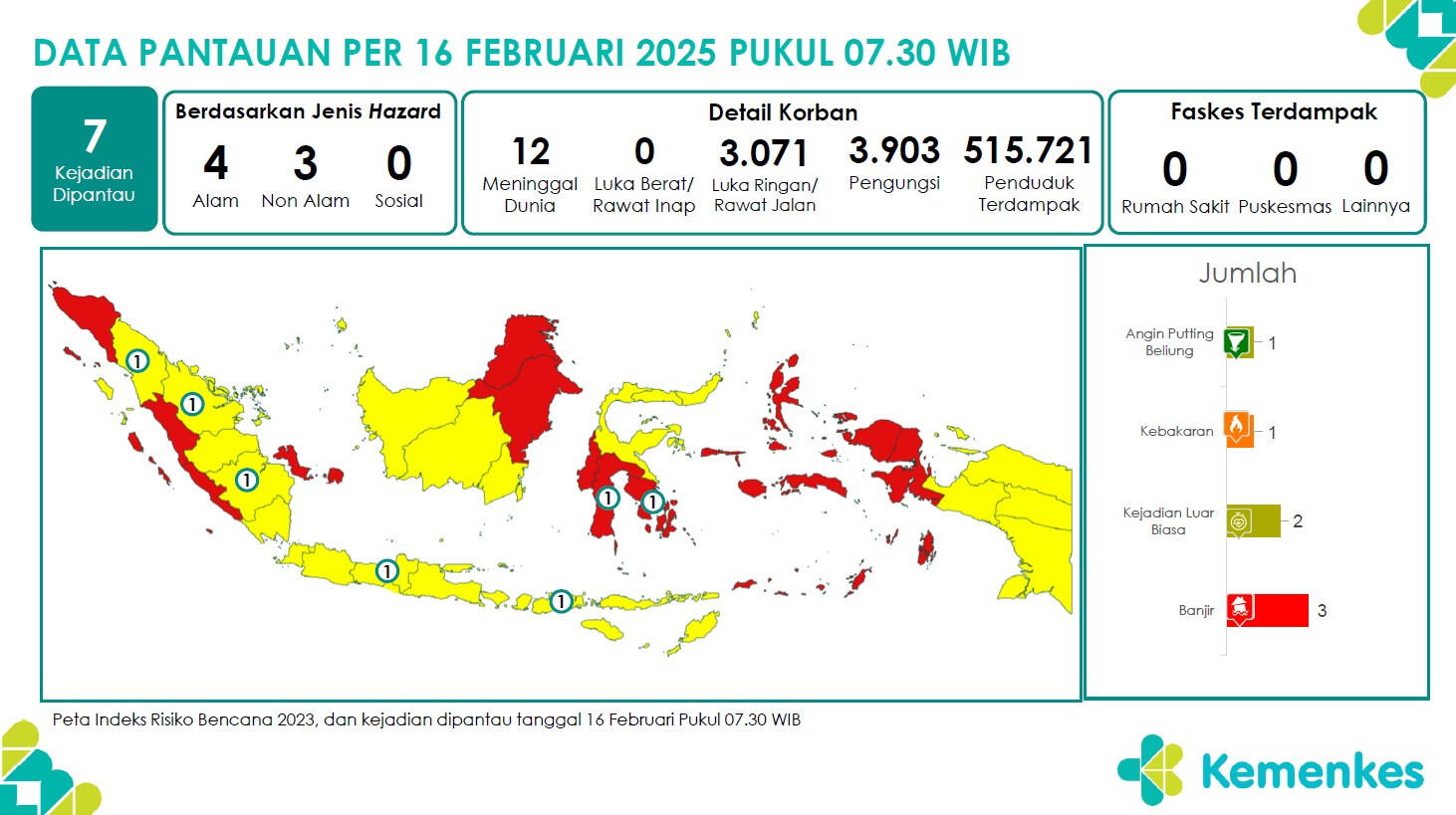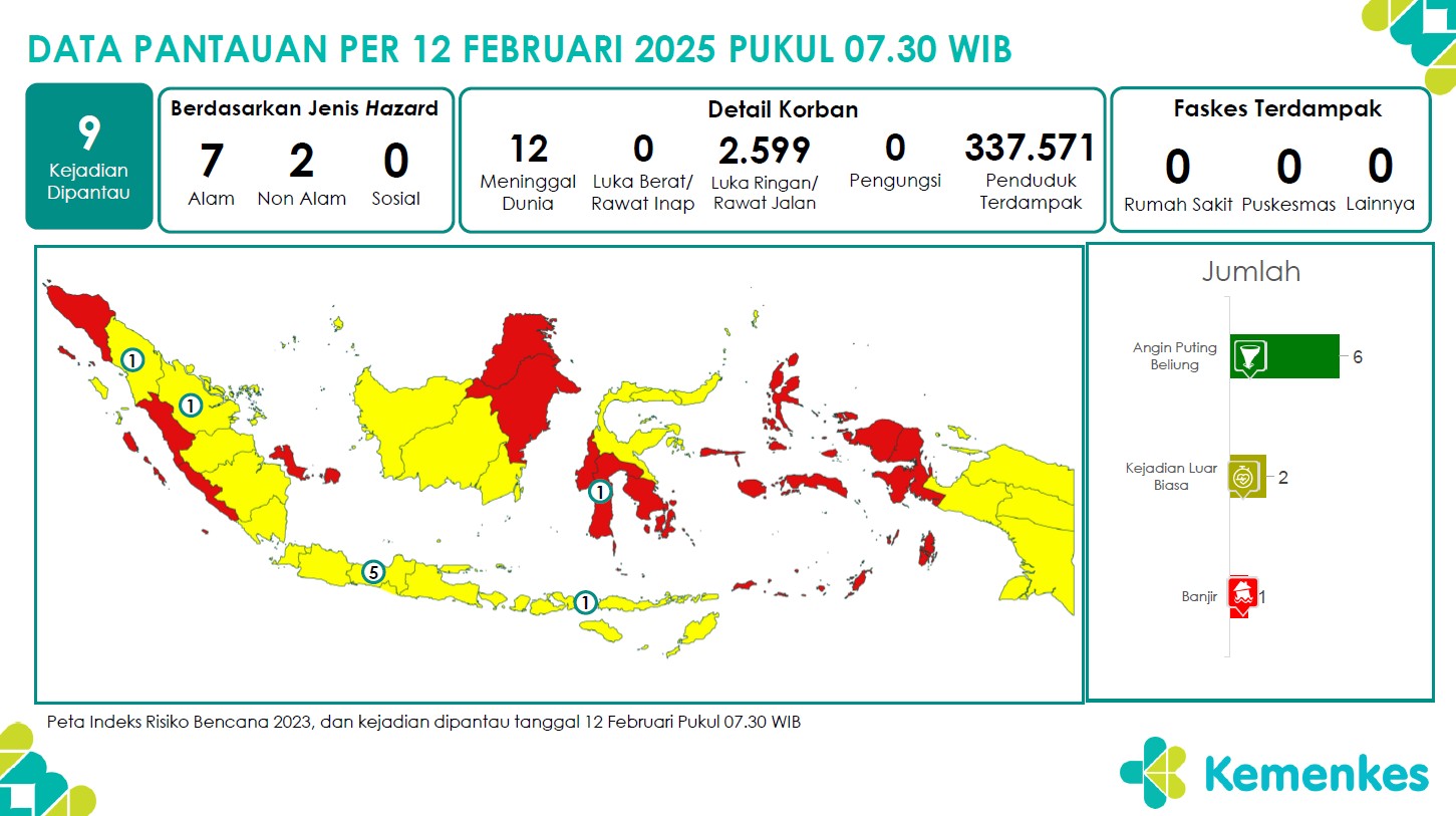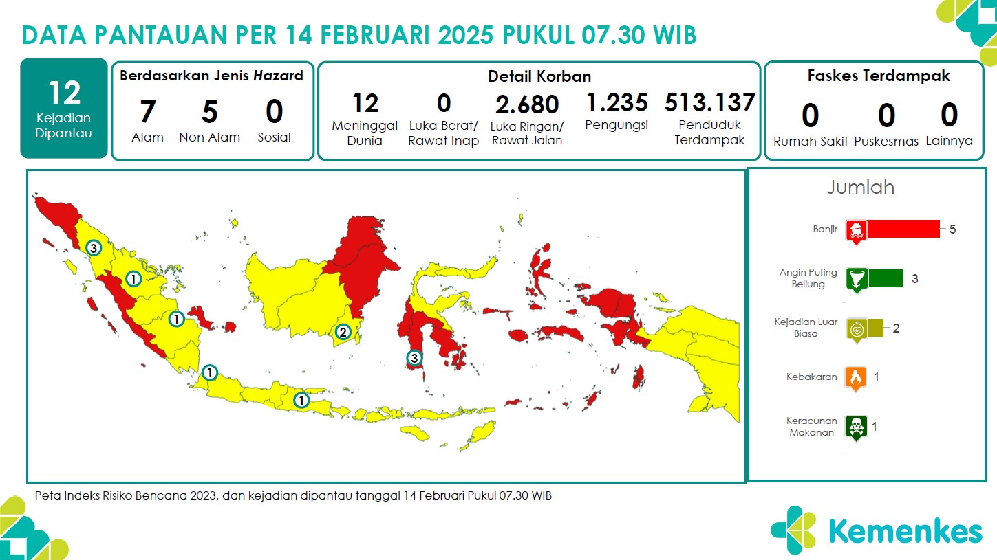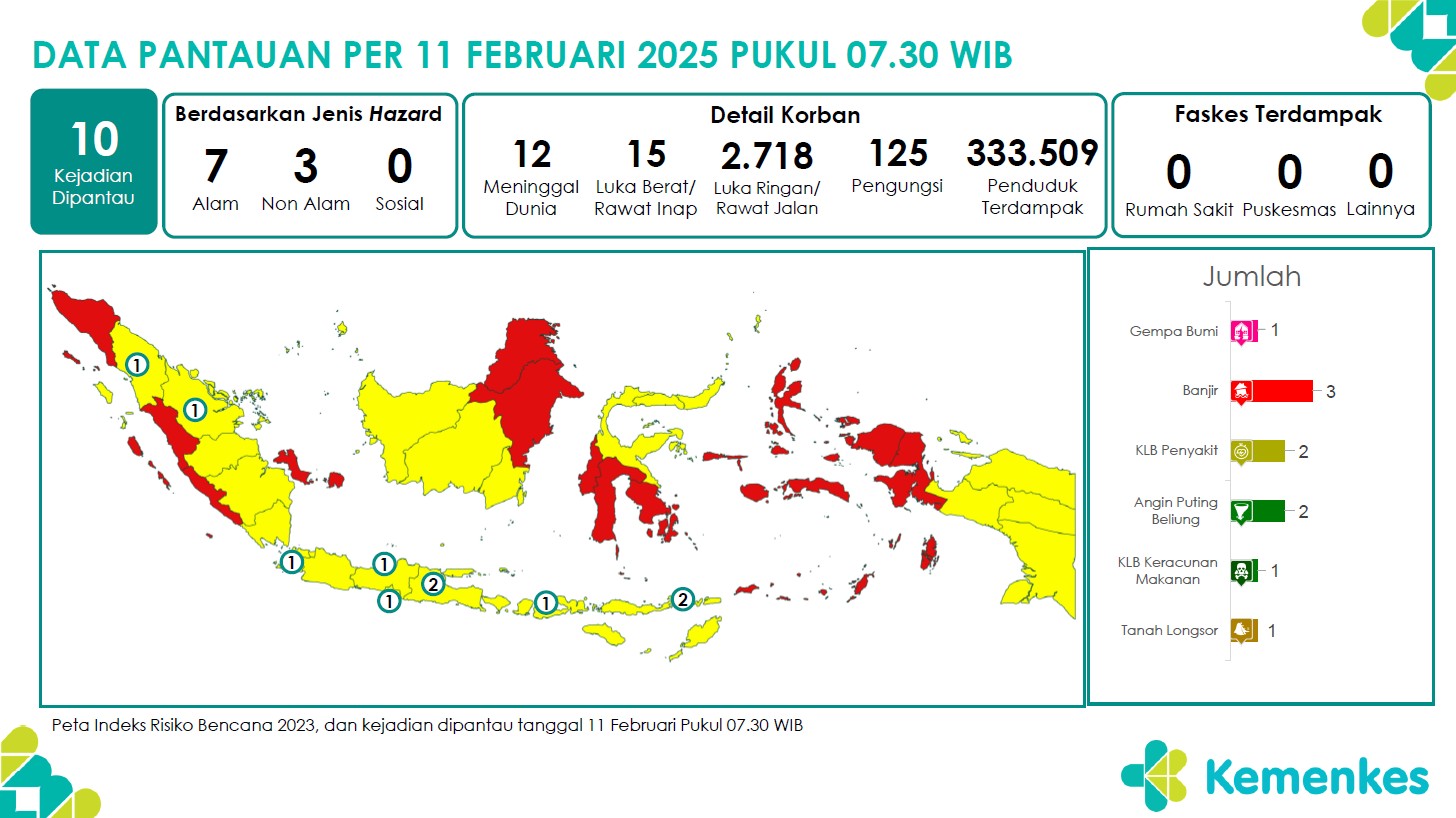Disini anda dapat mengunduh Laporan Pemantauan Harian Kejadian Krisis Kesehatan Pusat Krisis Kesehatan Kementerian Kesehatan tanggal 11 Februari 2025 pukul 07.30 WIB hingga 12 Februari 2025 pukul 0...