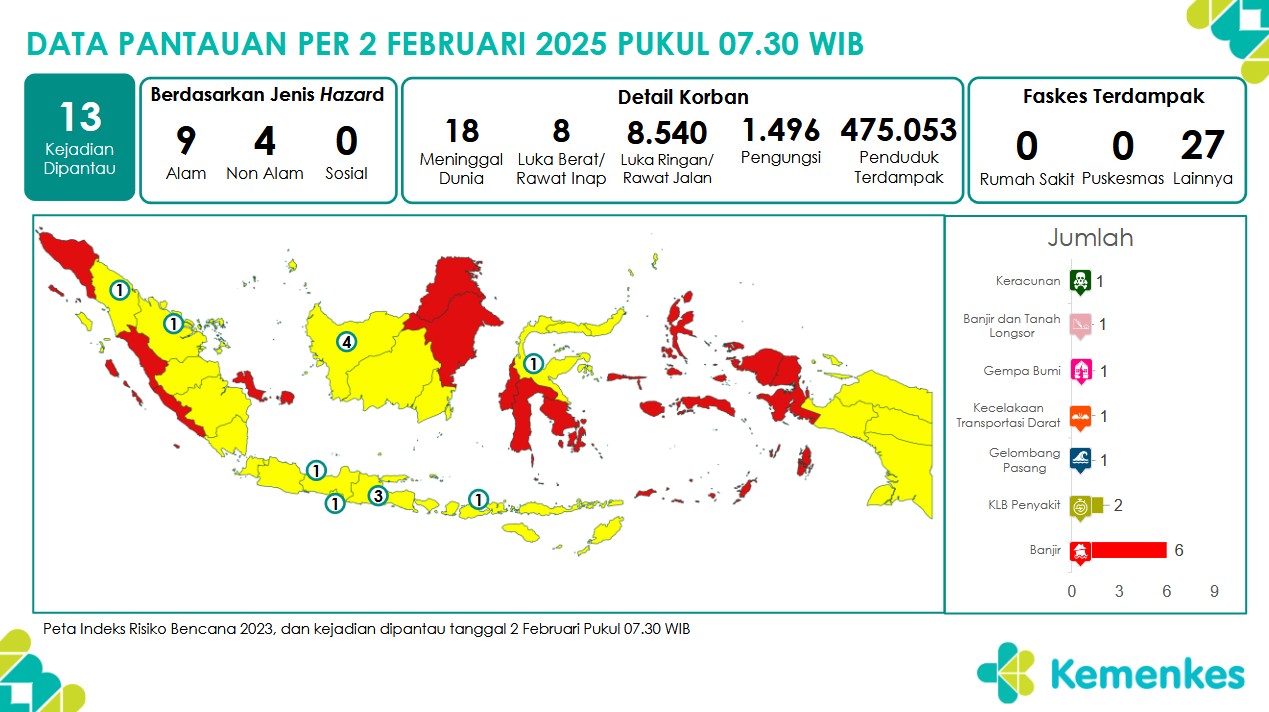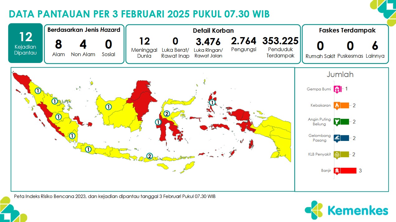 Disini anda dapat mengunduh Laporan Pemantauan Harian Kejadian Krisis Kesehatan Pusat Krisis Kesehatan Kementerian Kesehatan tanggal 2 Februari 2025 pukul 07.30 WIB hingga 3 Februari 2025 pukul 07....