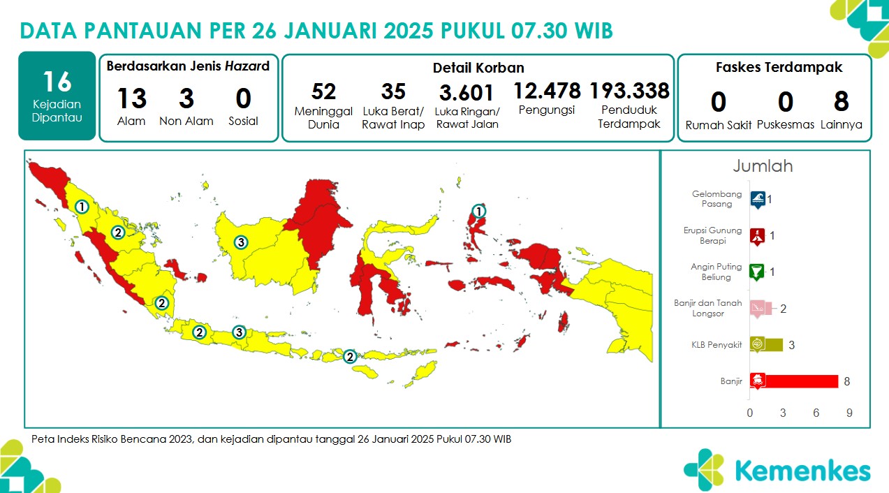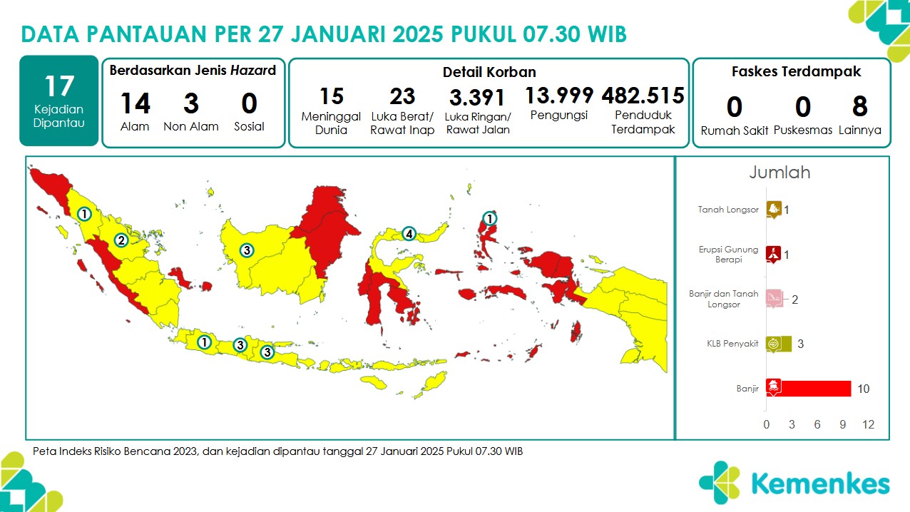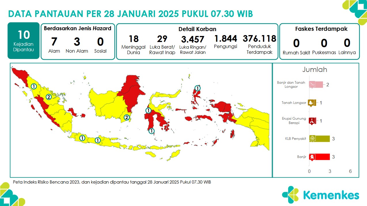 Disini anda dapat mengunduh Laporan Pemantauan Harian Kejadian Krisis Kesehatan Pusat Krisis Kesehatan Kementerian Kesehatan tanggal 28 Januari 2025 pukul 07.30 WIB hingga 29 Januari 2025 pukul 07....