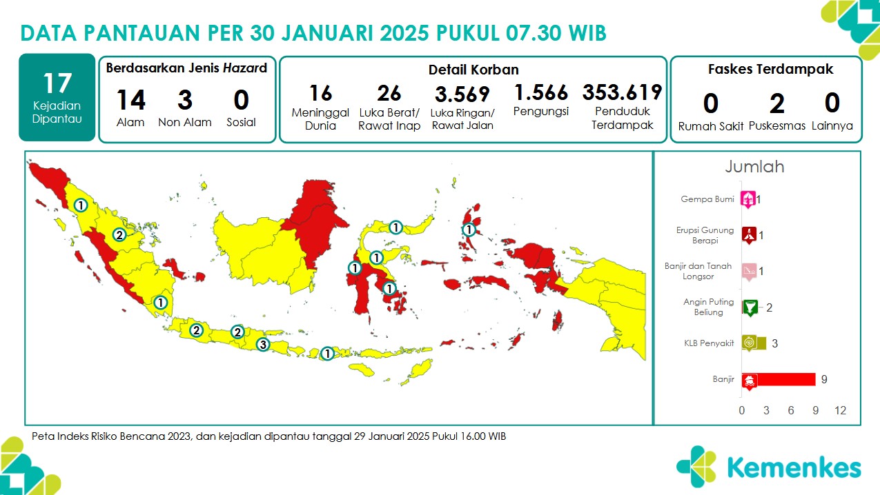 Disini anda dapat mengunduh Laporan Pemantauan Harian Kejadian Krisis Kesehatan Pusat Krisis Kesehatan Kementerian Kesehatan tanggal 29 Januari 2025 pukul 07.30 WIB hingga 30 Januari 2025 pukul 07....