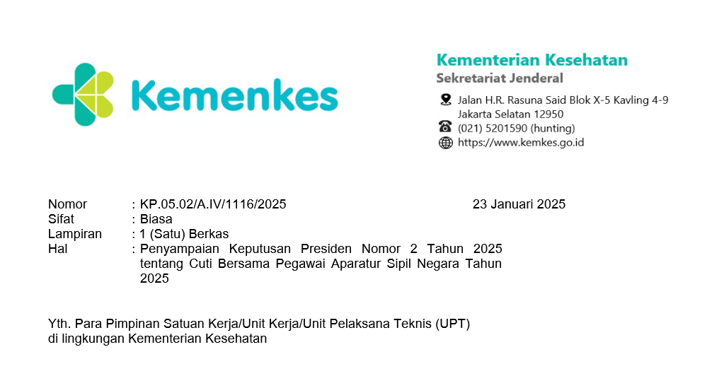 Yth. Para Pimpinan Satuan Kerja/Unit Kerja/Unit Pelaksana Teknis (UPT)di lingkungan Kementerian Kesehata...