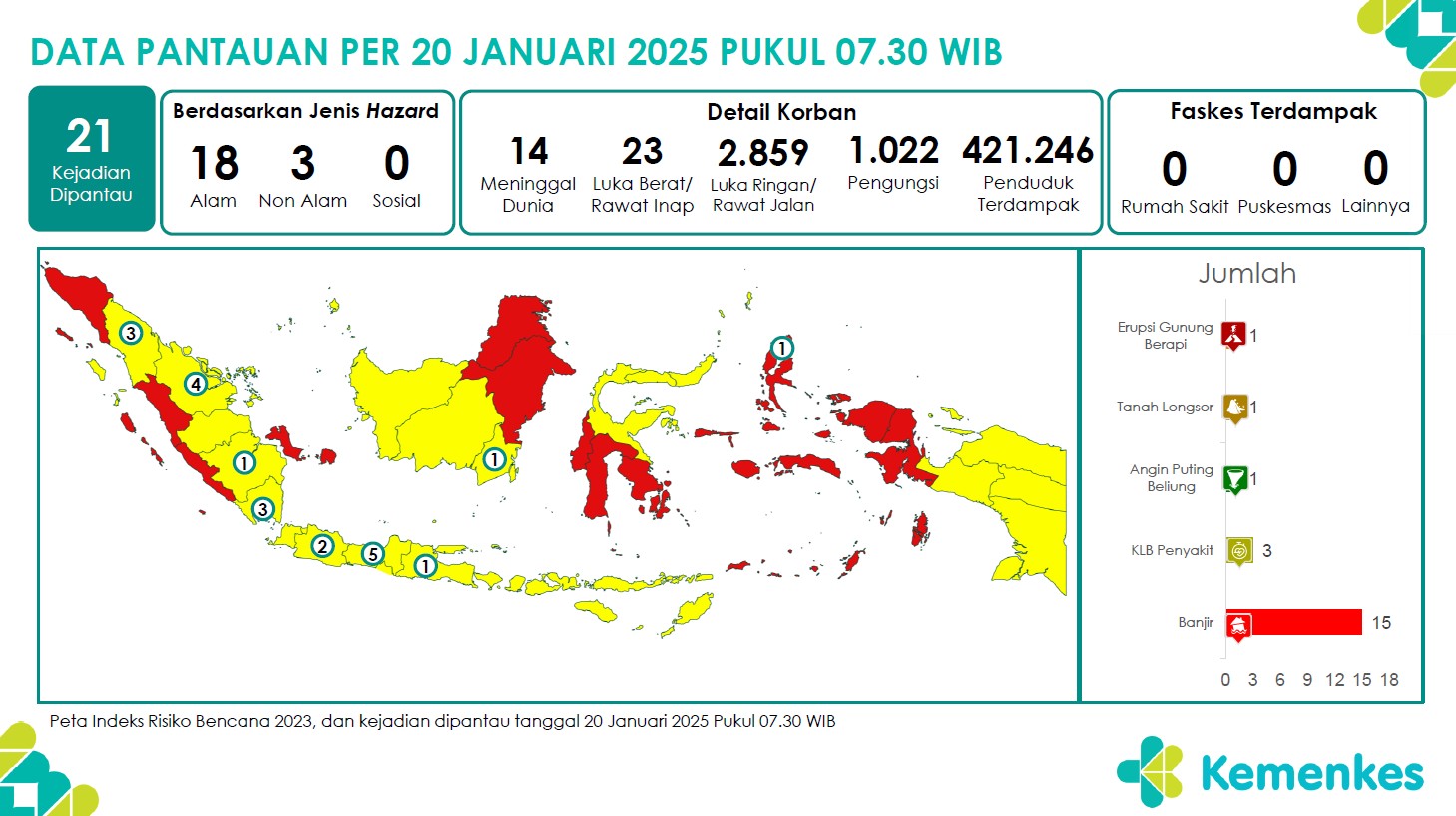 Disini anda dapat mengunduh Laporan Pemantauan Harian Kejadian Krisis Kesehatan Pusat Krisis Kesehatan Kementerian Kesehatan tanggal 20 Januari 2025 pukul 07.30 WIB hingga 21 Januari 2025 pukul 07....