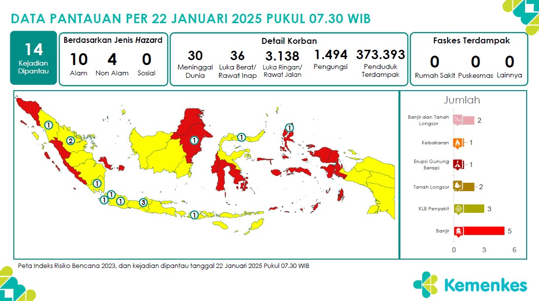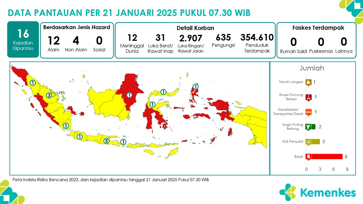 Disini anda dapat mengunduh Laporan Pemantauan Harian Kejadian Krisis Kesehatan Pusat Krisis Kesehatan Kementerian Kesehatan tanggal 21 Januari 2025 pukul 07.30 WIB hingga 22 Januari 2025 pukul 07....