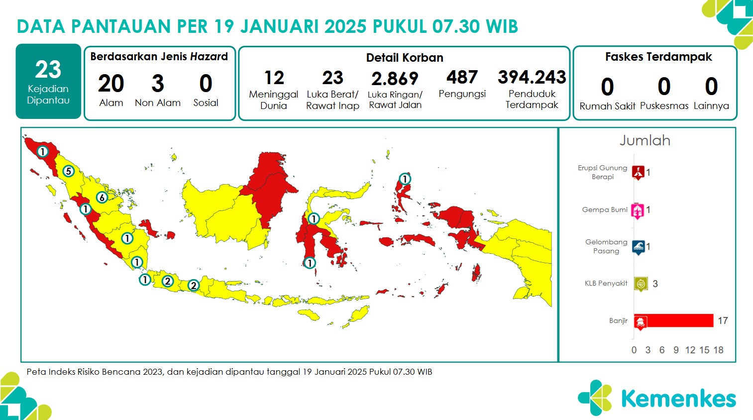 Disini anda dapat mengunduh Laporan Pemantauan Harian Kejadian Krisis Kesehatan Pusat Krisis Kesehatan Kementerian Kesehatan tanggal 17 Januari 2025 pukul 07.30 WIB hingga 18 Januari 2025 pukul 07....