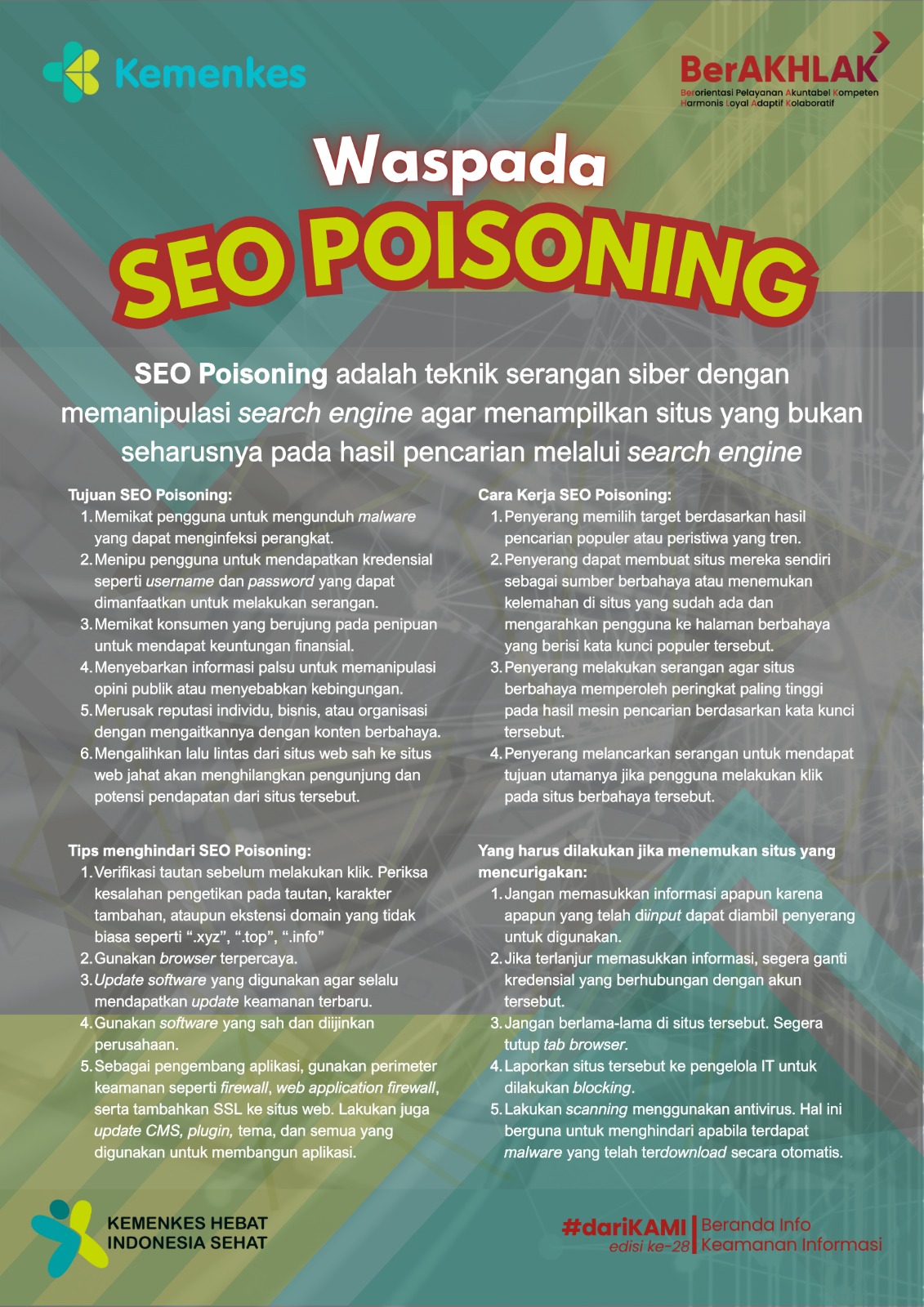 Hi Healthies ☺️Pernahkah Healthies mencari sesuatu melalui search engine, dan ketika memilih salah satu hasil pencarian, tetapi diarahkan ke situs yang tidak relevan dan mencurigakan?Jika demikian, Healthies mungkin telah mengalami Search Engine Optimization (SEO) Poisoning. Apa itu SEO poisoning? Yuk, simak infografis #dariKAMI berikut agar Healthies terhindar dari SEO poisoning 💪🏻 Beranda Informasi Keamanan Informasi#dariKAMI #28